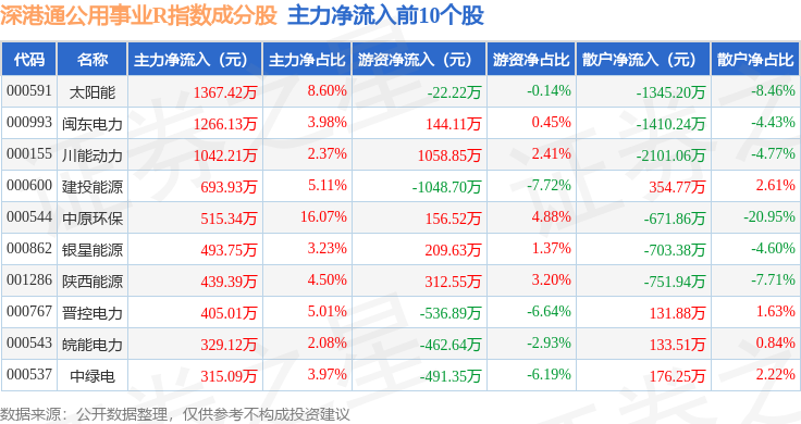 资金流向方面,深港通公用事业R(483031)指数成份股当日主力资金净流出合计1.13亿元,游资资金净流入合计286.29万元,散户资金净流入合计1.1亿元。成份股资金流向详情见下表: