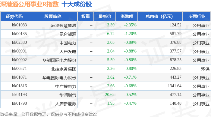 深港通公用事业R(483031)指数十大成份股详情如下: