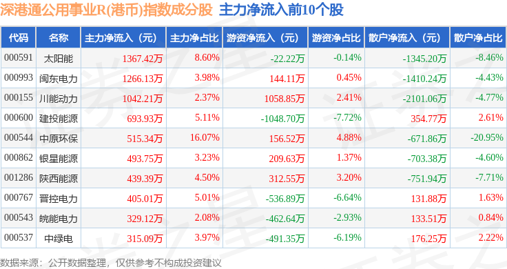 资金流向方面,深港通公用事业R(港币)(483032)指数成份股当日主力资金净流出合计1.13亿元,游资资金净流入合计286.29万元,散户资金净流入合计1.1亿元。成份股资金流向详情见下表: