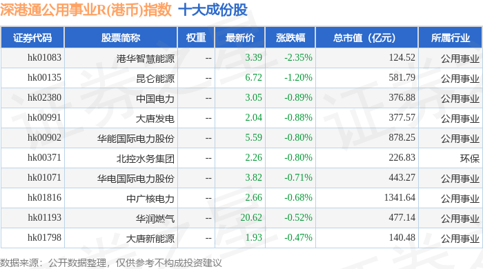 深港通公用事业R(港币)(483032)指数十大成份股详情如下: