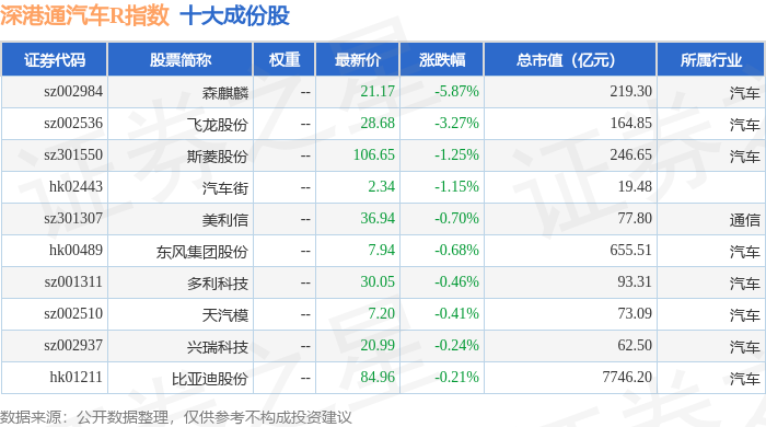 深港通汽车R(483039)指数十大成份股详情如下: