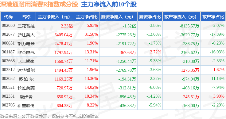 资金流向方面,深港通耐用消费R(483049)指数成份股当日主力资金净流入合计8093.11万元,游资资金净流出合计3.54亿元,散户资金净流入合计2.73亿元。成份股资金流向详情见下表: