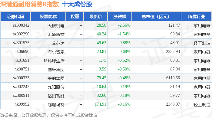 深港通耐用消费R(483049)指数十大成份股详情如下: