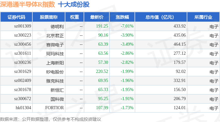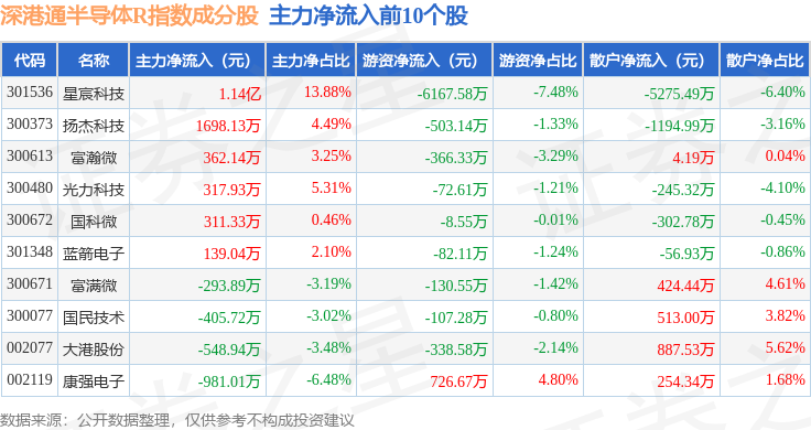 资金流向方面,深港通半导体R(483067)指数成份股当日主力资金净流出合计16.46亿元,游资资金净流入合计5.99亿元,散户资金净流入合计10.48亿元。成份股资金流向详情见下表: