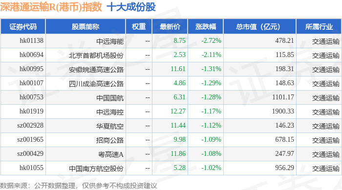 深港通运输R(港币)(483078)指数十大成份股详情如下: