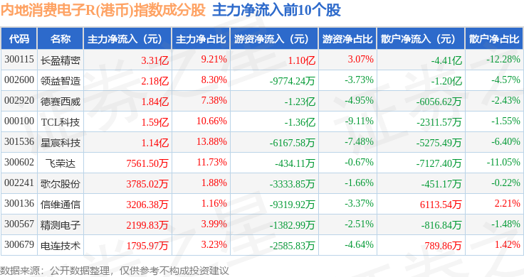 资金流向方面,内地消费电子R(港币)(483106)指数成份股当日主力资金净流出合计5.01亿元,游资资金净流出合计1.17亿元,散户资金净流入合计6.18亿元。成份股资金流向详情见下表: