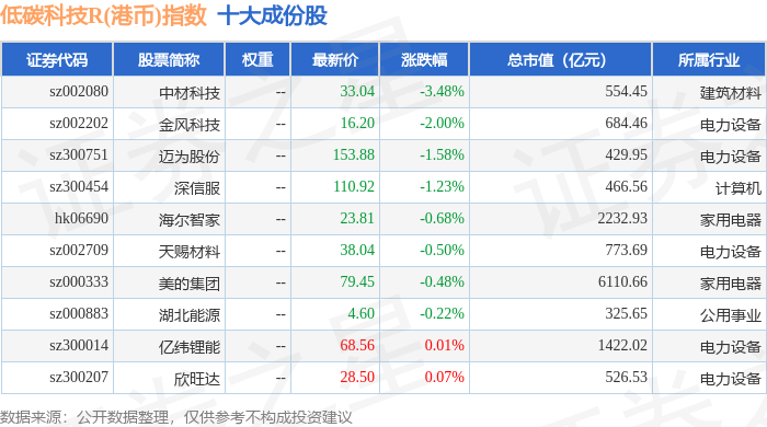 低碳科技R(港币)(483161)指数十大成份股详情如下:
