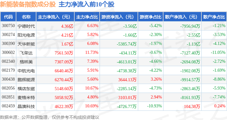 资金流向方面,新能装备(970043)指数成份股当日主力资金净流入合计3.93亿元,游资资金净流出合计6.44亿元,散户资金净流入合计2.51亿元。成份股资金流向详情见下表: