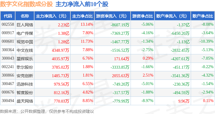 资金流向方面,数字文化(970047)指数成份股当日主力资金净流入合计2.02亿元,游资资金净流出合计3.96亿元,散户资金净流入合计1.94亿元。成份股资金流向详情见下表: