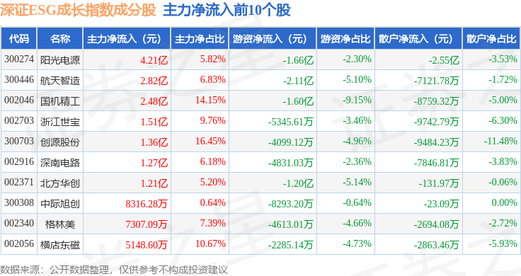 资金流向方面,深证ESG成长(970060)指数成份股当日主力资金净流出合计3.82亿元,游资资金净流出合计6.88亿元,散户资金净流入合计10.69亿元。成份股资金流向详情见下表: