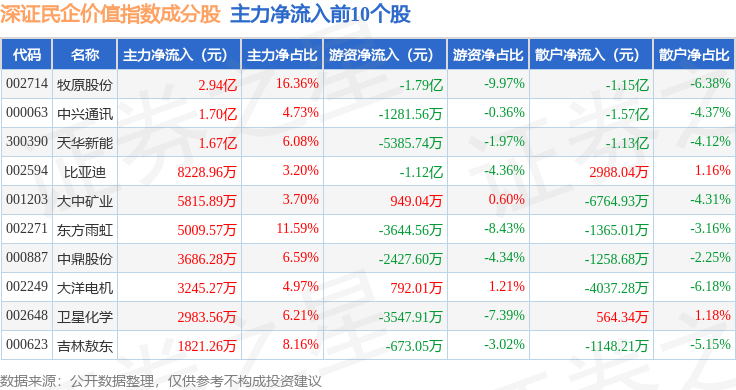 资金流向方面,深证民企价值(970072)指数成份股当日主力资金净流入合计2.47亿元,游资资金净流出合计5.06亿元,散户资金净流入合计2.59亿元。成份股资金流向详情见下表: