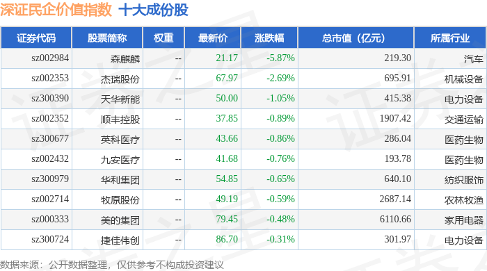 证券之星消息,12月19日,深证民企价值(970072)指数报收于3460.41点,涨0.55%,成交322.94亿元,换手率1.09%。当日该指数成份股中,上涨的有40家,恒逸石化以5.2%的涨幅领涨,下跌的有10家,森麒麟以5.87%的跌幅领跌。