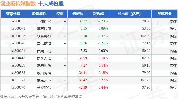 证券之星消息,12月19日,创业板传媒(970084)指数报收于1260.0点,涨0.97%,成交133.83亿元,换手率3.82%。当日该指数成份股中,上涨的有36家,荣信文化以6.12%的涨幅领涨,下跌的有4家,值得买以2.24%的跌幅领跌。