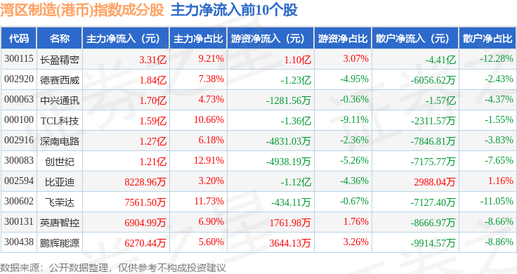 资金流向方面,湾区制造(港币)(980010)指数成份股当日主力资金净流出合计3.83亿元,游资资金净流出合计4.73亿元,散户资金净流入合计8.56亿元。成份股资金流向详情见下表: