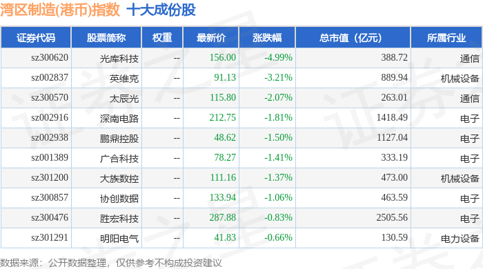 湾区制造(港币)(980010)指数十大成份股详情如下:
