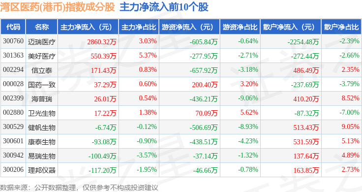 资金流向方面,湾区医药(港币)(980014)指数成份股当日主力资金净流出合计1.07亿元,游资资金净流出合计8695.79万元,散户资金净流入合计1.94亿元。成份股资金流向详情见下表: