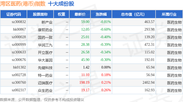 湾区医药(港币)(980014)指数十大成份股详情如下: