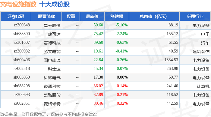 充电设施(980077)指数十大成份股详情如下: