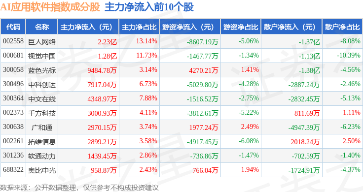 资金流向方面,AI应用软件(980107)指数成份股当日主力资金净流出合计4.01亿元,游资资金净流入合计1.64亿元,散户资金净流入合计2.37亿元。成份股资金流向详情见下表: