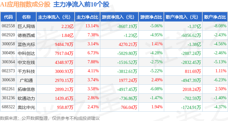 资金流向方面,AI应用(980112)指数成份股当日主力资金净流出合计2.1亿元,游资资金净流出合计7217.97万元,散户资金净流入合计2.82亿元。成份股资金流向详情见下表:
