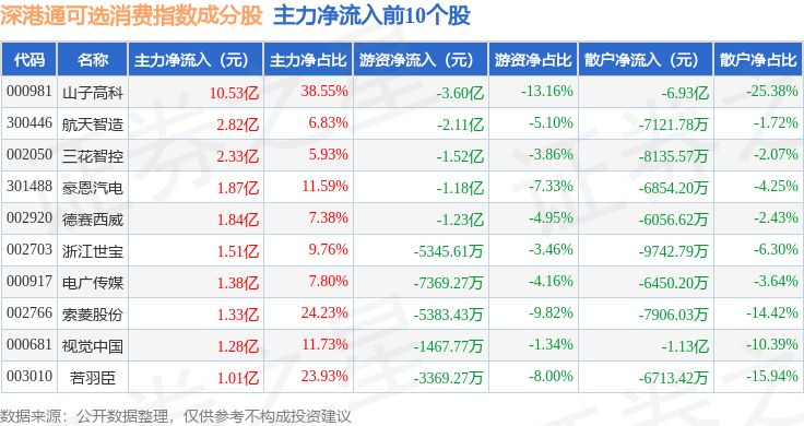 资金流向方面,深港通可选消费(983019)指数成份股当日主力资金净流入合计23.83亿元,游资资金净流出合计17.48亿元,散户资金净流出合计6.34亿元。成份股资金流向详情见下表: