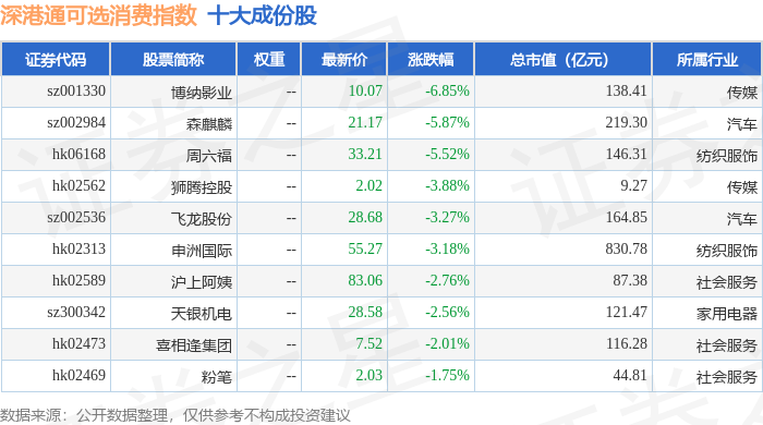 证券之星消息,12月19日,深港通可选消费(983019)指数报收于5591.26点,涨1.3%,成交1293.25亿元,换手率1.96%。当日该指数成份股中,上涨的有247家,佑驾创新以31.22%的涨幅领涨,下跌的有56家,博纳影业以6.85%的跌幅领跌。