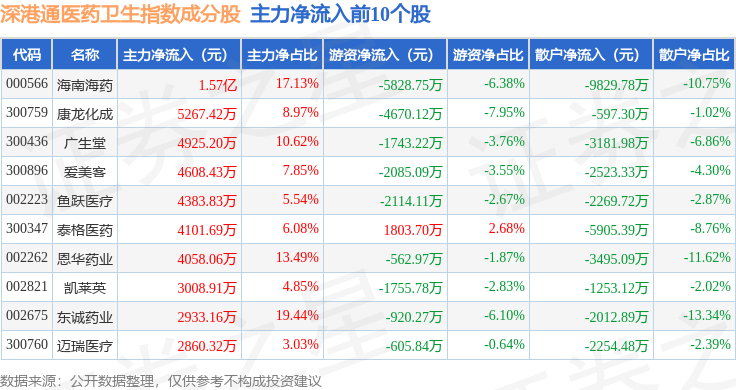 资金流向方面,深港通医药卫生(983023)指数成份股当日主力资金净流出合计14.18亿元,游资资金净流入合计1.71亿元,散户资金净流入合计12.47亿元。成份股资金流向详情见下表: