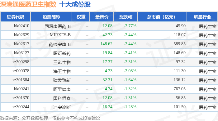 深港通医药卫生(983023)指数十大成份股详情如下: