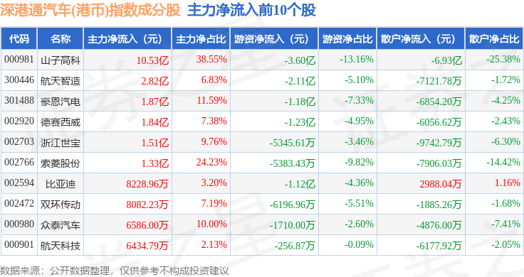 资金流向方面,深港通汽车(港币)(983040)指数成份股当日主力资金净流入合计22.58亿元,游资资金净流出合计13.69亿元,散户资金净流出合计8.89亿元。成份股资金流向详情见下表: