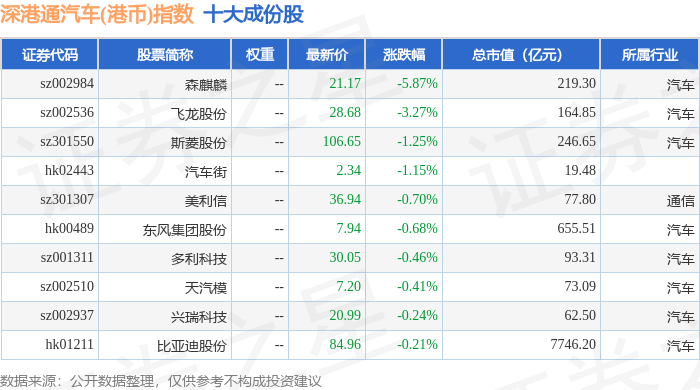 深港通汽车(港币)(983040)指数十大成份股详情如下: