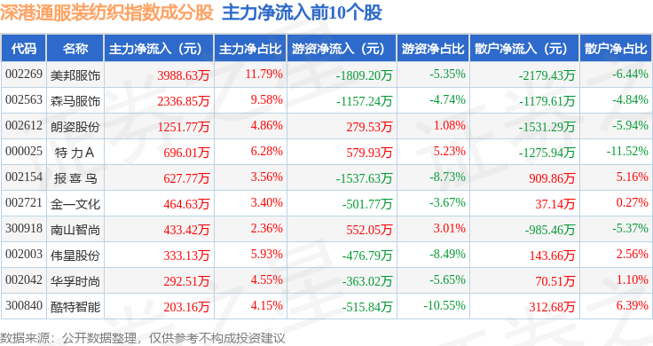 资金流向方面,深港通服装纺织(983041)指数成份股当日主力资金净流入合计8470.71万元,游资资金净流出合计5691.35万元,散户资金净流出合计2779.36万元。成份股资金流向详情见下表: