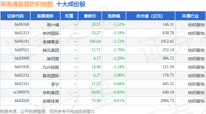 深港通服装纺织(983041)指数十大成份股详情如下: