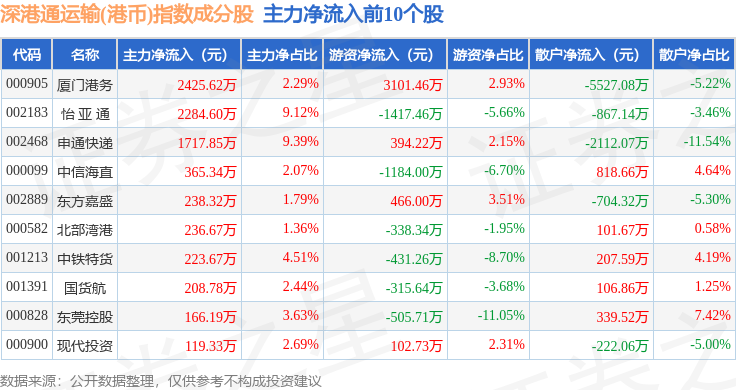 资金流向方面,深港通运输(港币)(983078)指数成份股当日主力资金净流出合计1.25亿元,游资资金净流出合计4196.33万元,散户资金净流入合计1.67亿元。成份股资金流向详情见下表: