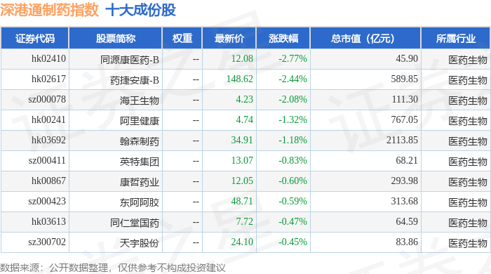 证券之星消息,12月19日,深港通制药(983079)指数报收于4597.16点,涨1.2%,成交231.02亿元,换手率1.28%。当日该指数成份股中,上涨的有85家,海南海药以10.03%的涨幅领涨,下跌的有15家,同源康医药-B以2.77%的跌幅领跌。