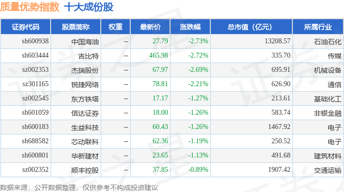 证券之星消息,12月19日,质量优势(989017)指数报收于8008.41点,涨0.5%,成交537.23亿元,换手率1.03%。当日该指数成份股中,上涨的有75家,云铝股份以6.48%的涨幅领涨,下跌的有20家,中国海油以2.73%的跌幅领跌。