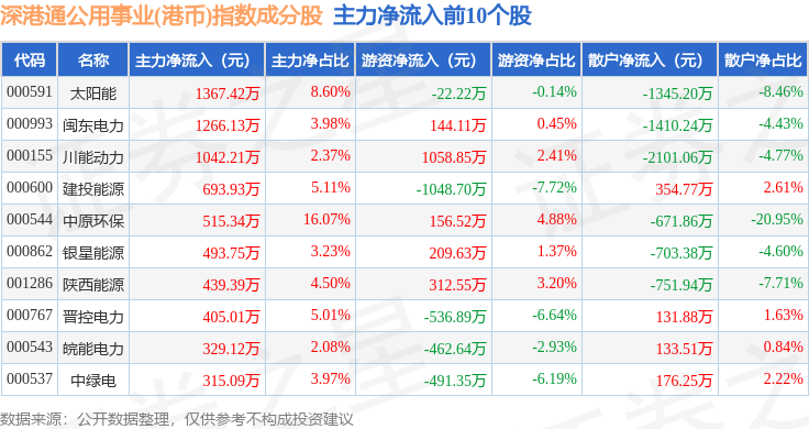 资金流向方面,深港通公用事业(港币)(983032)指数成份股当日主力资金净流出合计1.13亿元,游资资金净流入合计286.29万元,散户资金净流入合计1.1亿元。成份股资金流向详情见下表: