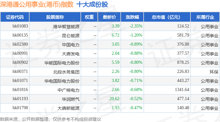 深港通公用事业(港币)(983032)指数十大成份股详情如下: