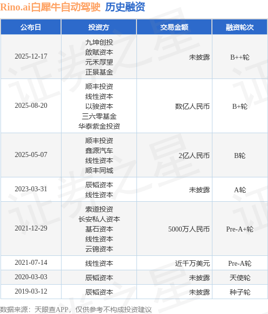 证券之星消息,根据天眼查APP于12月17日公布的信息整理,白犀牛智达(北京)科技有限公司B++轮融资,融资额未披露,参与投资的机构包括九坤创投,啟赋资本,元禾厚望,正景基金。