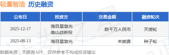 证券之星消息,根据天眼查APP于12月17日公布的信息整理,轻量智造(深圳)科技有限公司天使轮融资,融资额数千万人民币,参与投资的机构包括海目星激光,南山战新投。