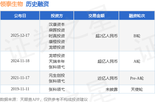 证券之星消息,根据天眼查APP于12月17日公布的信息整理,领泰生物医药(绍兴)有限公司B轮融资,融资额超2亿人民币,参与投资的机构包括汉康资本,鼎晖投资,时真投资,康橙投资,龙磐投资。