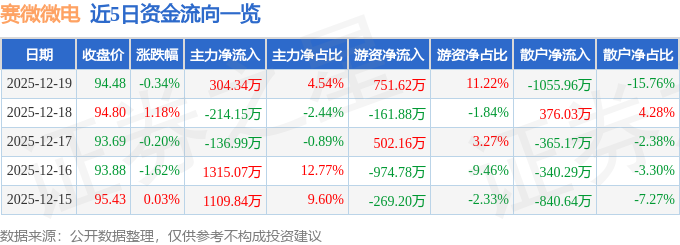 证券之星消息,截至2025年12月19日收盘,赛微微电(688325)报收于94.48元,下跌0.34%,换手率0.89%,成交量7099.0手,成交额6699.99万元。