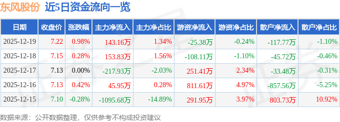 证券之星消息,截至2025年12月19日收盘,东风股份(600006)报收于7.22元,上涨0.98%,换手率0.74%,成交量14.85万手,成交额1.07亿元。