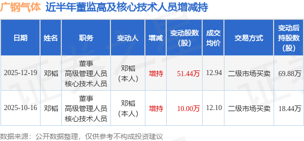 证券之星消息,根据12月19日市场公开信息、上市公司公告及交易所披露数据整理,广钢气体(688548)最新董监高及相关人员股份变动情况:2025年12月19日公司董事,高级管理人员,核心技术人员邓韬共增持公司股份51.44万股,占公司总股本为0.039%。变动期间公司股价上涨0.78%,12月19日当日收盘报12.95元。