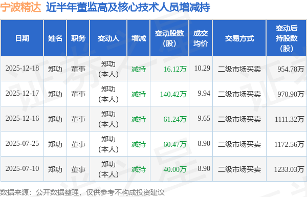 证券之星消息,根据12月19日市场公开信息、上市公司公告及交易所披露数据整理,宁波精达(603088)最新董监高及相关人员股份变动情况:2025年12月17日至2025年12月18日公司董事郑功共减持公司股份156.54万股,占公司总股本为0.3116%。变动期间公司股价上涨5.02%,12月18日当日收盘报10.04元。