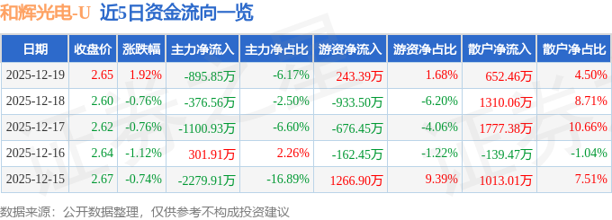 证券之星消息,截至2025年12月19日收盘,和辉光电(688538)报收于2.65元,上涨1.92%,换手率0.96%,成交量54.97万手,成交额1.45亿元。