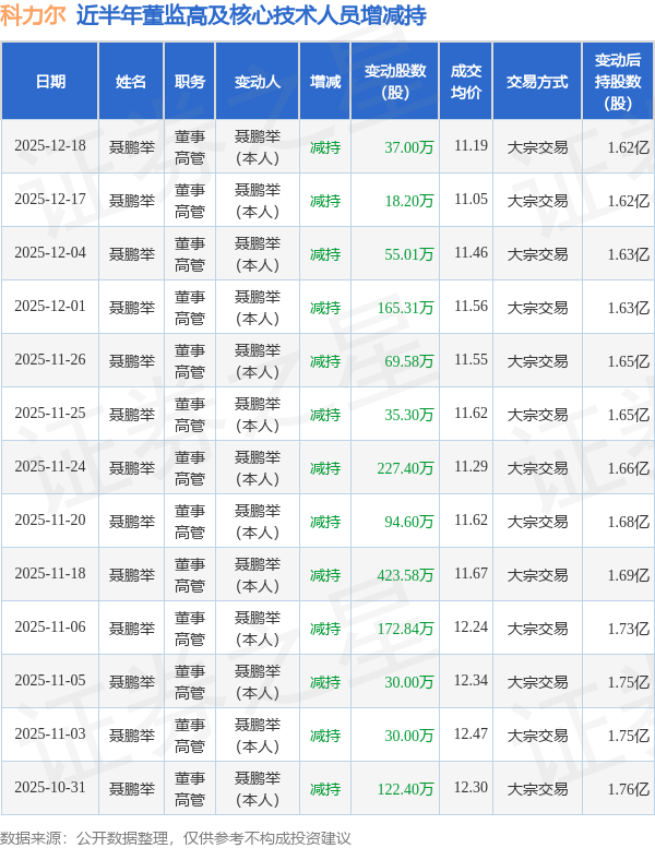 科力尔近半年内的董监高及核心技术人员增减持详情如下: