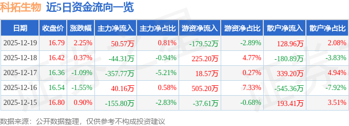 证券之星消息,截至2025年12月19日收盘,科拓生物(300858)报收于16.79元,上涨2.25%,换手率1.93%,成交量3.74万手,成交额6214.55万元。