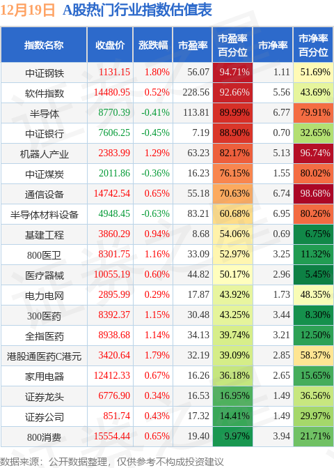 热门行业指数方面,中证钢铁的市盈率百分位较高,为94.71%。而800消费的市盈率百分位较低,为9.97%。