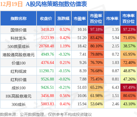 风格策略指数方面,国信价值的市盈率百分位较高,为97.18%。而300成长的市盈率百分位较低,为53.04%。