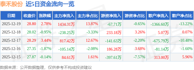 证券之星消息,截至2025年12月19日收盘,泰禾股份(301665)报收于28.8元,上涨2.78%,换手率9.47%,成交量3.62万手,成交额1.03亿元。